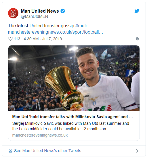 สื่อแดน มักกะโรนี ระบุว่าเอเยนต์ของ มิลินโควิช-ซาวิช ได้เดินทางมาถึง ลอนดอน ประเทศ อังกฤษ เพื่อเจรจากับ เร้ดเดวิลส์ ถึงความเป็นไปได้ในดีลที่ว่า ซึ่งต้นสังกัด ลาซิโอ ได้ปักป้ายแข้งรายนี้ไว้ที่ 80-100 ล้านยูโร (ราว 71.7 – 89.6 ล้านปอนด์) หลังจาก ปอล ป็อกบา ตกเป็นข่าวกับทั้ง ยูเวนตุส และ เรอัล มาดริด อย่างหนาหู