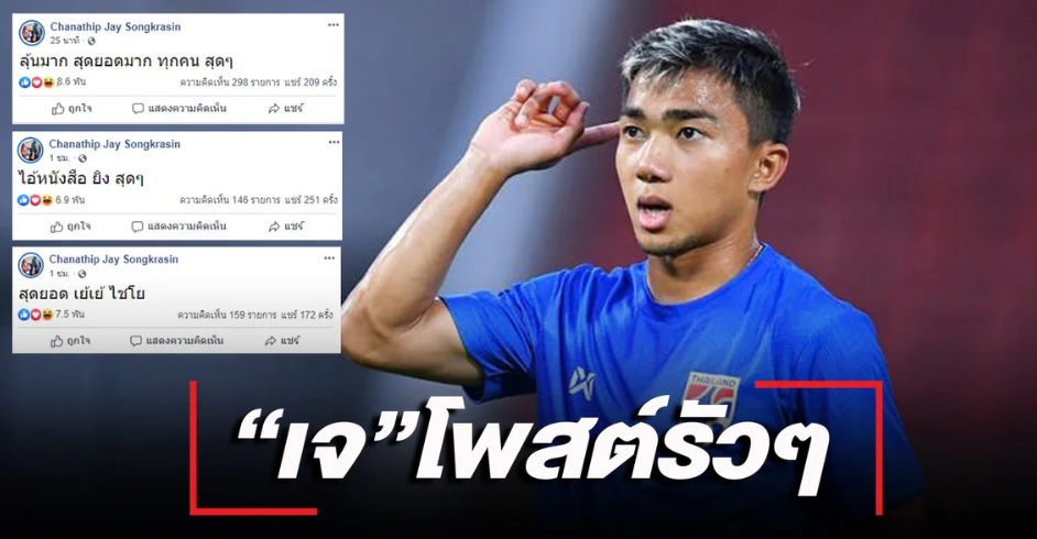 หลังจากที่ ทีมชาติไทย ทำผลงานยอดเยี่ยม ด้วยการเปิดบ้านชนะ ยูเออี 2-1 ในศึก ฟุตบอลโลก 2022 รอบคัดเลือก โซนเอเชีย รอบ 2 นัดที่ 3 เมื่อหัวค่ำที่ผ่านมา ชนาธิป สรงกระสินธ์ กองกลางทีมชาติไทย ที่โชคร้ายได้รับบาดเจ็บ พลาดลงสนามช่วยทีมในนัดนี้ ได้โพสต์เฟซบุ๊ก Chanathip Jay Songkrasin แบบรัวๆ หลังทัพ ช้างศึก เก็บ 3 คะแนนได้ โดยโพสต์ของ ชนาธิป มาแบบรัวๆ เริ่มตั้งแต่ ลุยสิ ครับ แจ่มจัด ตั้งแต่ก่อนเริ่มเกม ก่อนจะมาโพสต์ว่า สุดยอด เย้เย้ ไชโย ในตอนที่ มุ้ย ธีรศิลป์ แดงดา โขกให้ ไทย นำ 1-0 จากนั้นโพสต์อีกว่า เน็ตไม่ดี อย่างเซ็ง ในตอนที่ ไทย โดยตีเสมอ 1-1 และมาโพสต์ว่า ไอ้หนังสือ ยิง สุดๆ ในตอนนี้ เอกนิษฐ์ ปัญญา ยิงให้ ไทย ขึ้นนำ 2-1 ก่อนจะปิดท้ายด้วยโพสต์ ลุ้นมาก สุดยอดมาก ทุกคน สุดๆ ในตอนจบเกมที่ ไไทย เก็บชัยชนะได้ สำหรับโปรแกรมการแข่งขันนัดต่อไปของ ทีมชาติไทย จะออกไปเยือน มาเลเซีย ในวันที่ 14 พ.ย. ต่อด้วยการไปเยือน เวียดนาม วันที่ 19 พ.ย. ซึ่ง 2 นัดนี้ ชนาธิป จะหายบาดเจ็บ และจะกลับมาช่วย ทีมชาติไทย ได้อย่างแน่นอน