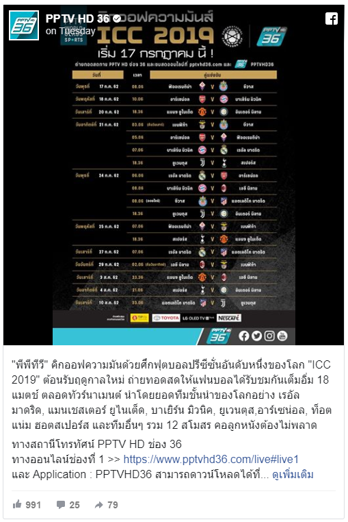 โดยโปรแกรมการถ่ายทอดสดทัวร์นาเมนต์ อินเตอร์เนชันแนล แชมเปี้ยนส์คัพ 2019 โดย พีพีทีวี เอชดี 36 สามารถติดตามได้ที่นี่